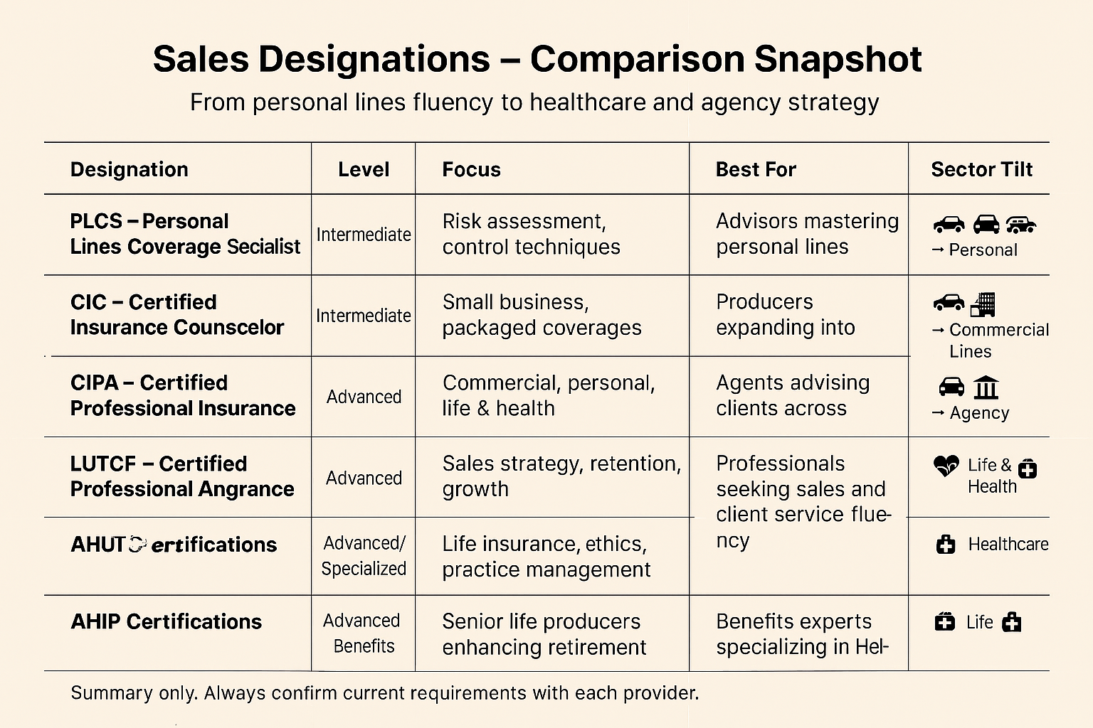 Her journey—from personal lines quoting to benefits consulting and agency leadership—mirrors the broader sales and client service pathway. Credentials like PLCS, CLCS, and AINS build foundational fluency. CIC and CISR deepen technical precision. CPIA, CPCU, and LUTCF signal leadership in growth, ethics, and client strategy. Sector-specific credentials like REBC, LACP, and AHIP support specialization in benefits, life, and healthcare.